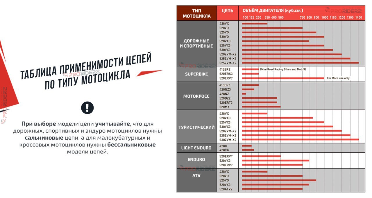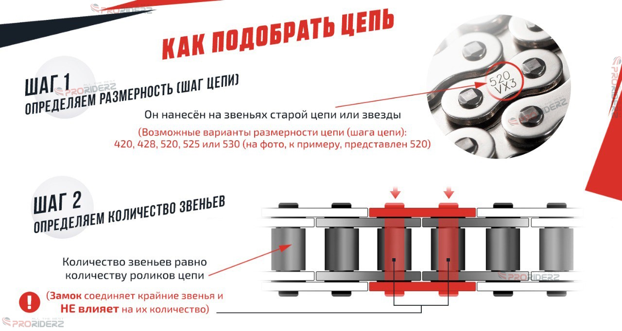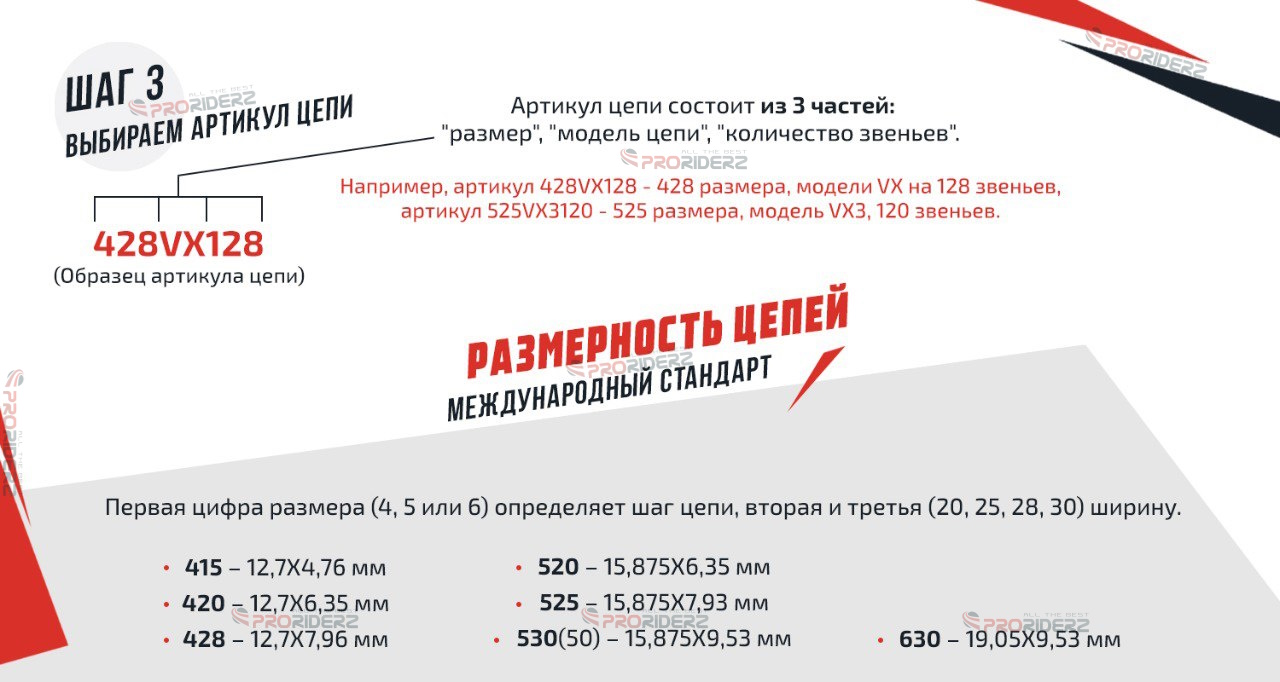 Правильное определение шага цепи на мотоцикле или квадроцикле обеспечит надёжность и безопасность вашего транспортного средства. Следуя рекомендациям нашего интернет-магазина мотозапчастей и мотоэкипировки Proriderz.ru, вы сможете сделать осознанный выбор и наслаждаться комфортной ездой!
