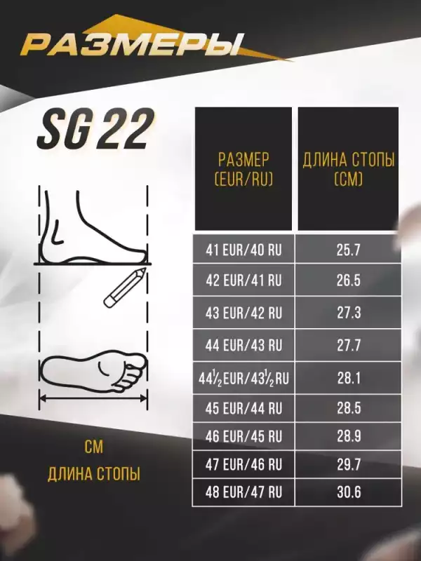 - Рекомендуем подбирать мотоботы Gaerne SG-22 по размерной сетке производителя, но так как ширина ноги у всех разная, иногда требуется пара на размер больше.