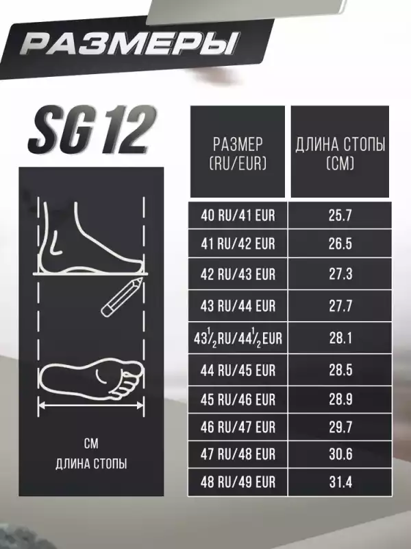 · По назначению: В ассортименте также версия SG-12 Enduro с цепкой подошвой для бездорожья.