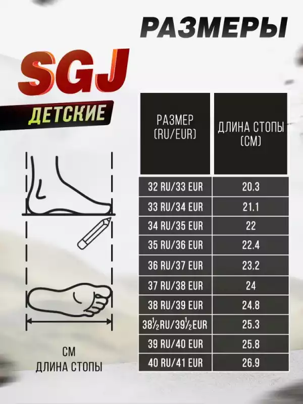 1. Ключевой параметр — длина стопы ребёнка в см.