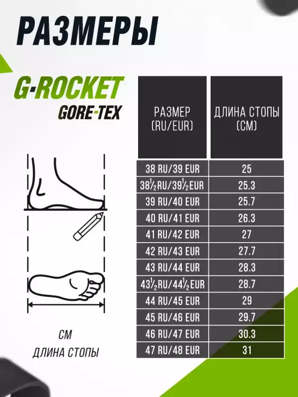 1. Измерьте стопу: Поставьте ногу на лист бумаги, отметьте самую выступающую точку пятки и самый длинный палец. Измерьте расстояние (в см). Лучше делать это вечером — стопа немного отекает.