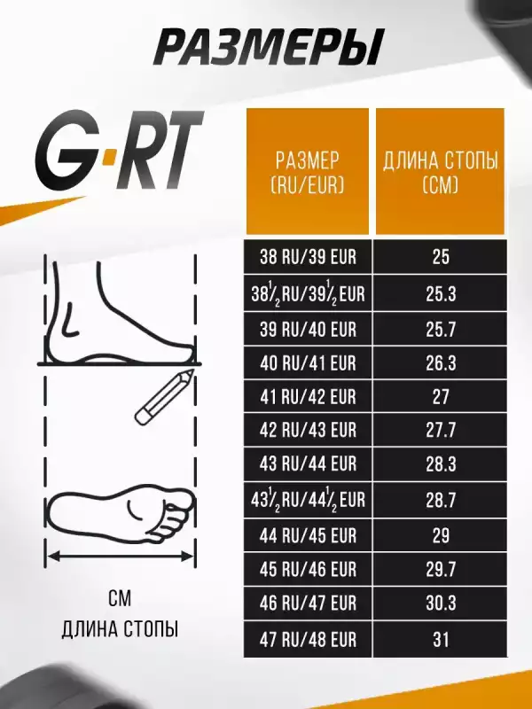 1. Измерьте стопу: Поставьте ногу на лист бумаги, отметьте самую выступающую точку пятки и самый длинный палец. Измерьте расстояние (в см). Лучше делать это вечером — стопа немного отекает.
