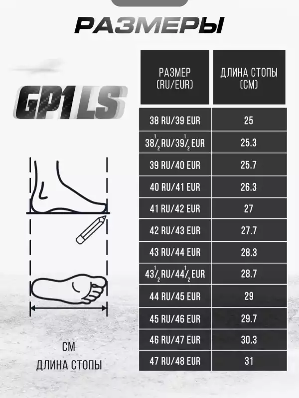 Мотоботы Gaerne GP1 LS имеют гоночную колодку — они должны сидеть плотно, но не жать. Ключевой параметр — длина стопы в сантиметрах.